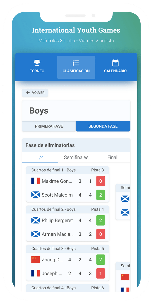 Combina grupos, cuadros de eliminatorias y partidos individuales para crear tu formato de torneo ideal.
